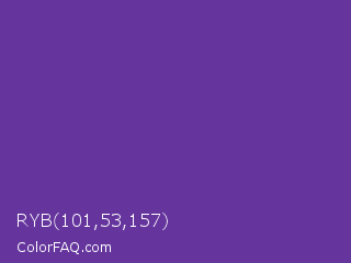 RYB 101,53,157 Color is a normal violet color and the nearest color is Purple Heart #69359c. Hex code #65359d and RGB value is rgb(101,53,157). In RGB color space, this color is composed of 40% red, 21% green, 62% blue, In CMYK color space, this color is composed of 36% cyan, 66% magenta, 0% yellow , 38% black , In HSL color space, this color has a hue angle of 268° , 50% saturation and 41% lightness.
