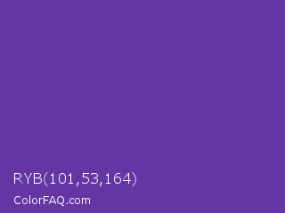 RYB 101,53,164 Color is a normal violet color and the nearest color is Purple Heart #69359c. Hex code #6535a4 and RGB value is rgb(101,53,164). In RGB color space, this color is composed of 40% red, 21% green, 64% blue, In CMYK color space, this color is composed of 38% cyan, 68% magenta, 0% yellow , 36% black , In HSL color space, this color has a hue angle of 266° , 51% saturation and 43% lightness.