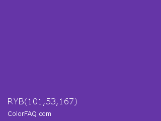 RYB 101,53,167 Color is a normal violet color and the nearest color is Purple Heart #69359c. Hex code #6535a7 and RGB value is rgb(101,53,167). In RGB color space, this color is composed of 40% red, 21% green, 65% blue, In CMYK color space, this color is composed of 40% cyan, 68% magenta, 0% yellow , 35% black , In HSL color space, this color has a hue angle of 265° , 52% saturation and 43% lightness.