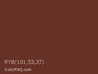 RYB 101,53,37 Color is a dark red color and the nearest color is Liver Organ #6c2e1f. Hex code #653225 and RGB value is rgb(101,50,37). In RGB color space, this color is composed of 40% red, 20% green, 15% blue, In CMYK color space, this color is composed of 0% cyan, 50% magenta, 63% yellow , 60% black , In HSL color space, this color has a hue angle of 12° , 46% saturation and 27% lightness.