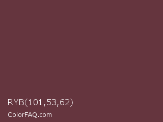 RYB 101,53,62 Color is a dark red color and the nearest color is Wine Dregs #673147. Hex code #65353e and RGB value is rgb(101,53,62). In RGB color space, this color is composed of 40% red, 21% green, 24% blue, In CMYK color space, this color is composed of 0% cyan, 48% magenta, 39% yellow , 60% black , In HSL color space, this color has a hue angle of 349° , 31% saturation and 30% lightness.