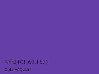 RYB 101,63,167 Color is a normal violet color and the nearest color is Royal Purple #6b3fa0. Hex code #653fa7 and RGB value is rgb(101,63,167). In RGB color space, this color is composed of 40% red, 25% green, 65% blue, In CMYK color space, this color is composed of 40% cyan, 62% magenta, 0% yellow , 35% black , In HSL color space, this color has a hue angle of 262° , 45% saturation and 45% lightness.