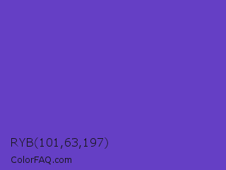 RYB 101,63,197 Color is a normal indigo color and the nearest color is Purple Heart Crayola #652dc1. Hex code #653fc5 and RGB value is rgb(101,63,197). In RGB color space, this color is composed of 40% red, 25% green, 77% blue, In CMYK color space, this color is composed of 49% cyan, 68% magenta, 0% yellow , 23% black , In HSL color space, this color has a hue angle of 257° , 54% saturation and 51% lightness.