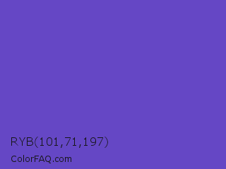 RYB 101,71,197 Color is a normal indigo color and the nearest color is Iris #5a4fcf. Hex code #6547c5 and RGB value is rgb(101,71,197). In RGB color space, this color is composed of 40% red, 28% green, 77% blue, In CMYK color space, this color is composed of 49% cyan, 64% magenta, 0% yellow , 23% black , In HSL color space, this color has a hue angle of 254° , 52% saturation and 53% lightness.