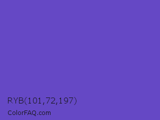 RYB 101,72,197 Color is a normal indigo color and the nearest color is Iris #5a4fcf. Hex code #6548c5 and RGB value is rgb(101,72,197). In RGB color space, this color is composed of 40% red, 28% green, 77% blue, In CMYK color space, this color is composed of 49% cyan, 63% magenta, 0% yellow , 23% black , In HSL color space, this color has a hue angle of 254° , 52% saturation and 53% lightness.