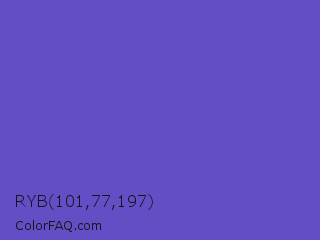 RYB 101,77,197 Color is a normal indigo color and the nearest color is Iris #5a4fcf. Hex code #654dc5 and RGB value is rgb(101,77,197). In RGB color space, this color is composed of 40% red, 30% green, 77% blue, In CMYK color space, this color is composed of 49% cyan, 61% magenta, 0% yellow , 23% black , In HSL color space, this color has a hue angle of 252° , 51% saturation and 54% lightness.