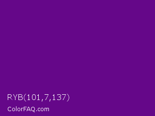 RYB 101,7,137 Color is a dark purple color and the nearest color is Purple #660099. Hex code #650789 and RGB value is rgb(101,7,137). In RGB color space, this color is composed of 40% red, 3% green, 54% blue, In CMYK color space, this color is composed of 26% cyan, 95% magenta, 0% yellow , 46% black , In HSL color space, this color has a hue angle of 283° , 90% saturation and 28% lightness.
