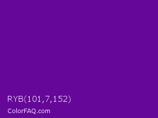 RYB 101,7,152 Color is a normal purple color and the nearest color is Purple #660099. Hex code #650798 and RGB value is rgb(101,7,152). In RGB color space, this color is composed of 40% red, 3% green, 60% blue, In CMYK color space, this color is composed of 34% cyan, 95% magenta, 0% yellow , 40% black , In HSL color space, this color has a hue angle of 279° , 91% saturation and 31% lightness.