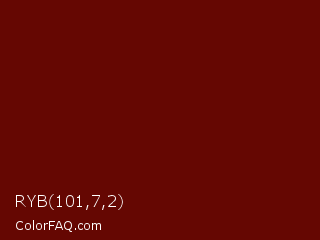RYB 101,7,2 Color is a very dark red color and the nearest color is Red Oxide #6e0902. Hex code #650702 and RGB value is rgb(101,7,2). In RGB color space, this color is composed of 40% red, 3% green, 1% blue, In CMYK color space, this color is composed of 0% cyan, 93% magenta, 98% yellow , 60% black , In HSL color space, this color has a hue angle of 3° , 96% saturation and 20% lightness.