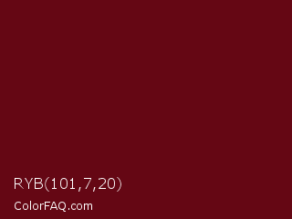 RYB 101,7,20 Color is a very dark red color and the nearest color is Dark Tan #661010. Hex code #650714 and RGB value is rgb(101,7,20). In RGB color space, this color is composed of 40% red, 3% green, 8% blue, In CMYK color space, this color is composed of 0% cyan, 93% magenta, 80% yellow , 60% black , In HSL color space, this color has a hue angle of 352° , 87% saturation and 21% lightness.