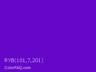 RYB 101,7,201 Color is a normal violet color and the nearest color is French Violet #8806ce. Hex code #6507c9 and RGB value is rgb(101,7,201). In RGB color space, this color is composed of 40% red, 3% green, 79% blue, In CMYK color space, this color is composed of 50% cyan, 97% magenta, 0% yellow , 21% black , In HSL color space, this color has a hue angle of 269° , 93% saturation and 41% lightness.