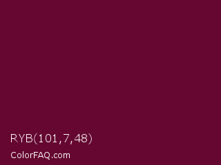 RYB 101,7,48 Color is a very dark rose color and the nearest color is Black Rose #67032d. Hex code #650730 and RGB value is rgb(101,7,48). In RGB color space, this color is composed of 40% red, 3% green, 19% blue, In CMYK color space, this color is composed of 0% cyan, 93% magenta, 52% yellow , 60% black , In HSL color space, this color has a hue angle of 334° , 87% saturation and 21% lightness.