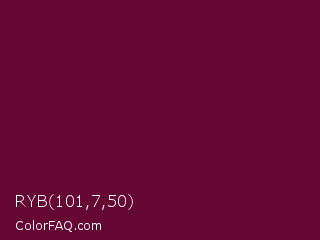 RYB 101,7,50 Color is a very dark rose color and the nearest color is Black Rose #67032d. Hex code #650732 and RGB value is rgb(101,7,50). In RGB color space, this color is composed of 40% red, 3% green, 20% blue, In CMYK color space, this color is composed of 0% cyan, 93% magenta, 50% yellow , 60% black , In HSL color space, this color has a hue angle of 333° , 87% saturation and 21% lightness.