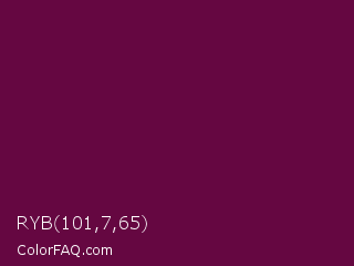RYB 101,7,65 Color is a very dark magenta color and the nearest color is Tyrian Purple #66023c. Hex code #650741 and RGB value is rgb(101,7,65). In RGB color space, this color is composed of 40% red, 3% green, 25% blue, In CMYK color space, this color is composed of 0% cyan, 93% magenta, 36% yellow , 60% black , In HSL color space, this color has a hue angle of 323° , 87% saturation and 21% lightness.