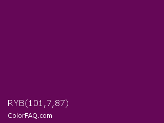 RYB 101,7,87 Color is a very dark magenta color and the nearest color is Pompadour #660045. Hex code #650757 and RGB value is rgb(101,7,87). In RGB color space, this color is composed of 40% red, 3% green, 34% blue, In CMYK color space, this color is composed of 0% cyan, 93% magenta, 14% yellow , 60% black , In HSL color space, this color has a hue angle of 309° , 87% saturation and 21% lightness.