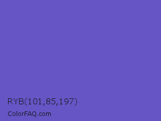 RYB 101,85,197 Color is a normal indigo color and the nearest color is Slate Blue #6a5acd. Hex code #6555c5 and RGB value is rgb(101,85,197). In RGB color space, this color is composed of 40% red, 33% green, 77% blue, In CMYK color space, this color is composed of 49% cyan, 57% magenta, 0% yellow , 23% black , In HSL color space, this color has a hue angle of 249° , 49% saturation and 55% lightness.