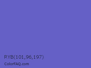 RYB 101,96,197 Color is a normal indigo color and the nearest color is Slate Blue #6a5acd. Hex code #6560c5 and RGB value is rgb(101,96,197). In RGB color space, this color is composed of 40% red, 38% green, 77% blue, In CMYK color space, this color is composed of 49% cyan, 51% magenta, 0% yellow , 23% black , In HSL color space, this color has a hue angle of 243° , 47% saturation and 57% lightness.