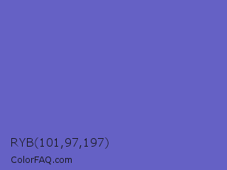 RYB 101,97,197 Color is a normal indigo color and the nearest color is Slate Blue #6a5acd. Hex code #6561c5 and RGB value is rgb(101,97,197). In RGB color space, this color is composed of 40% red, 38% green, 77% blue, In CMYK color space, this color is composed of 49% cyan, 51% magenta, 0% yellow , 23% black , In HSL color space, this color has a hue angle of 242° , 46% saturation and 58% lightness.
