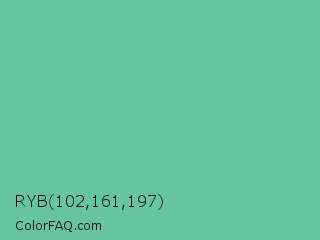 RYB 102,161,197 Color is a normal green color and the nearest color is Tradewind #5fb3ac. Hex code #66c5a0 and RGB value is rgb(102,197,160). In RGB color space, this color is composed of 40% red, 77% green, 63% blue, In CMYK color space, this color is composed of 48% cyan, 0% magenta, 19% yellow , 23% black , In HSL color space, this color has a hue angle of 157° , 45% saturation and 59% lightness.