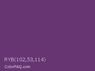 RYB 102,53,114 Color is a normal purple color and the nearest color is Imperial #602f6b. Hex code #663572 and RGB value is rgb(102,53,114). In RGB color space, this color is composed of 40% red, 21% green, 45% blue, In CMYK color space, this color is composed of 11% cyan, 54% magenta, 0% yellow , 55% black , In HSL color space, this color has a hue angle of 288° , 37% saturation and 33% lightness.