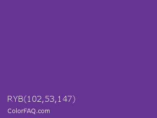 RYB 102,53,147 Color is a normal purple color and the nearest color is Rebecca Purple #663399. Hex code #663593 and RGB value is rgb(102,53,147). In RGB color space, this color is composed of 40% red, 21% green, 58% blue, In CMYK color space, this color is composed of 31% cyan, 64% magenta, 0% yellow , 42% black , In HSL color space, this color has a hue angle of 271° , 47% saturation and 39% lightness.