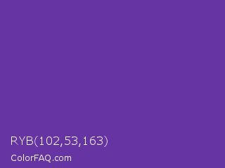 RYB 102,53,163 Color is a normal violet color and the nearest color is Purple Heart #69359c. Hex code #6635a3 and RGB value is rgb(102,53,163). In RGB color space, this color is composed of 40% red, 21% green, 64% blue, In CMYK color space, this color is composed of 37% cyan, 67% magenta, 0% yellow , 36% black , In HSL color space, this color has a hue angle of 267° , 51% saturation and 42% lightness.