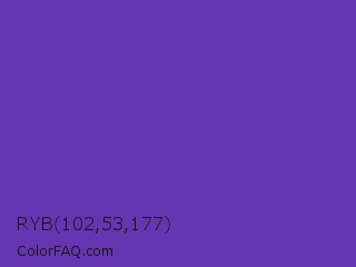 RYB 102,53,177 Color is a normal violet color and the nearest color is Grape #6f2da8. Hex code #6635b1 and RGB value is rgb(102,53,177). In RGB color space, this color is composed of 40% red, 21% green, 69% blue, In CMYK color space, this color is composed of 42% cyan, 70% magenta, 0% yellow , 31% black , In HSL color space, this color has a hue angle of 264° , 54% saturation and 45% lightness.