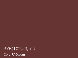 RYB 102,53,51 Color is a dark red color and the nearest color is Buccaneer #622f30. Hex code #663533 and RGB value is rgb(102,53,51). In RGB color space, this color is composed of 40% red, 21% green, 20% blue, In CMYK color space, this color is composed of 0% cyan, 48% magenta, 50% yellow , 60% black , In HSL color space, this color has a hue angle of 2° , 33% saturation and 30% lightness.