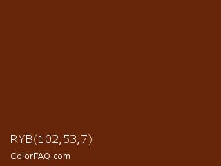 RYB 102,53,7 Color is a very dark orange color and the nearest color is Brown Bramble #592804. Hex code #662607 and RGB value is rgb(102,38,7). In RGB color space, this color is composed of 40% red, 15% green, 3% blue, In CMYK color space, this color is composed of 0% cyan, 63% magenta, 93% yellow , 60% black , In HSL color space, this color has a hue angle of 20° , 87% saturation and 21% lightness.