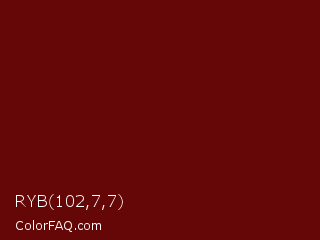 RYB 102,7,7 Color is a very dark red color and the nearest color is Rosewood #65000b. Hex code #660707 and RGB value is rgb(102,7,7). In RGB color space, this color is composed of 40% red, 3% green, 3% blue, In CMYK color space, this color is composed of 0% cyan, 93% magenta, 93% yellow , 60% black , In HSL color space, this color has a hue angle of 0° , 87% saturation and 21% lightness.