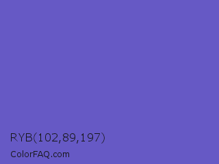 RYB 102,89,197 Color is a normal indigo color and the nearest color is Slate Blue #6a5acd. Hex code #6659c5 and RGB value is rgb(102,89,197). In RGB color space, this color is composed of 40% red, 35% green, 77% blue, In CMYK color space, this color is composed of 48% cyan, 55% magenta, 0% yellow , 23% black , In HSL color space, this color has a hue angle of 247° , 48% saturation and 56% lightness.