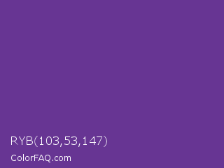 RYB 103,53,147 Color is a normal purple color and the nearest color is Rebecca Purple #663399. Hex code #673593 and RGB value is rgb(103,53,147). In RGB color space, this color is composed of 40% red, 21% green, 58% blue, In CMYK color space, this color is composed of 30% cyan, 64% magenta, 0% yellow , 42% black , In HSL color space, this color has a hue angle of 272° , 47% saturation and 39% lightness.