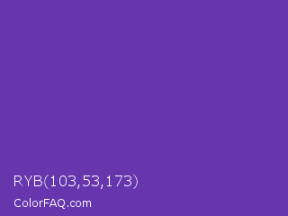 RYB 103,53,173 Color is a normal violet color and the nearest color is Grape #6f2da8. Hex code #6735ad and RGB value is rgb(103,53,173). In RGB color space, this color is composed of 40% red, 21% green, 68% blue, In CMYK color space, this color is composed of 40% cyan, 69% magenta, 0% yellow , 32% black , In HSL color space, this color has a hue angle of 265° , 53% saturation and 44% lightness.