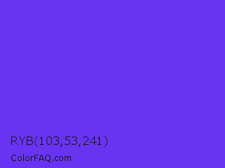 RYB 103,53,241 Color is a normal indigo color and the nearest color is Majorelle Blue #6050dc. Hex code #6735f1 and RGB value is rgb(103,53,241). In RGB color space, this color is composed of 40% red, 21% green, 95% blue, In CMYK color space, this color is composed of 57% cyan, 78% magenta, 0% yellow , 5% black , In HSL color space, this color has a hue angle of 256° , 87% saturation and 58% lightness.