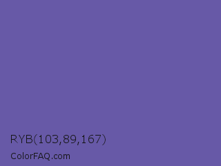 RYB 103,89,167 Color is a normal indigo color and the nearest color is Scampi #675fa6. Hex code #6759a7 and RGB value is rgb(103,89,167). In RGB color space, this color is composed of 40% red, 35% green, 65% blue, In CMYK color space, this color is composed of 38% cyan, 47% magenta, 0% yellow , 35% black , In HSL color space, this color has a hue angle of 251° , 31% saturation and 50% lightness.
