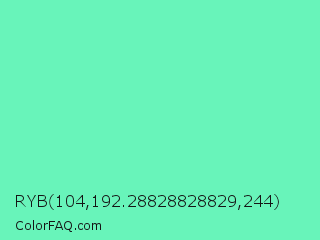 RYB 104,192.28828828829,244 Color is a light green color and the nearest color is Medium Aquamarine #66ddaa. Hex code #68f4ba and RGB value is rgb(104,244,186). In RGB color space, this color is composed of 41% red, 96% green, 73% blue, In CMYK color space, this color is composed of 57% cyan, 0% magenta, 24% yellow , 4% black , In HSL color space, this color has a hue angle of 155° , 86% saturation and 68% lightness.