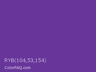 RYB 104,53,154 Color is a normal violet color and the nearest color is Purple Heart #69359c. Hex code #68359a and RGB value is rgb(104,53,154). In RGB color space, this color is composed of 41% red, 21% green, 60% blue, In CMYK color space, this color is composed of 32% cyan, 66% magenta, 0% yellow , 40% black , In HSL color space, this color has a hue angle of 270° , 49% saturation and 41% lightness.