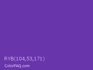 RYB 104,53,171 Color is a normal violet color and the nearest color is Grape #6f2da8. Hex code #6835ab and RGB value is rgb(104,53,171). In RGB color space, this color is composed of 41% red, 21% green, 67% blue, In CMYK color space, this color is composed of 39% cyan, 69% magenta, 0% yellow , 33% black , In HSL color space, this color has a hue angle of 266° , 53% saturation and 44% lightness.