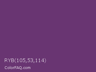 RYB 105,53,114 Color is a normal purple color and the nearest color is Imperial #602f6b. Hex code #693572 and RGB value is rgb(105,53,114). In RGB color space, this color is composed of 41% red, 21% green, 45% blue, In CMYK color space, this color is composed of 8% cyan, 54% magenta, 0% yellow , 55% black , In HSL color space, this color has a hue angle of 291° , 37% saturation and 33% lightness.