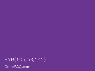 RYB 105,53,145 Color is a normal purple color and the nearest color is Rebecca Purple #663399. Hex code #693591 and RGB value is rgb(105,53,145). In RGB color space, this color is composed of 41% red, 21% green, 57% blue, In CMYK color space, this color is composed of 28% cyan, 63% magenta, 0% yellow , 43% black , In HSL color space, this color has a hue angle of 274° , 46% saturation and 39% lightness.
