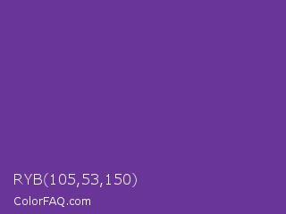 RYB 105,53,150 Color is a normal purple color and the nearest color is Rebecca Purple #663399. Hex code #693596 and RGB value is rgb(105,53,150). In RGB color space, this color is composed of 41% red, 21% green, 59% blue, In CMYK color space, this color is composed of 30% cyan, 65% magenta, 0% yellow , 41% black , In HSL color space, this color has a hue angle of 272° , 48% saturation and 40% lightness.