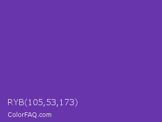 RYB 105,53,173 Color is a normal violet color and the nearest color is Grape #6f2da8. Hex code #6935ad and RGB value is rgb(105,53,173). In RGB color space, this color is composed of 41% red, 21% green, 68% blue, In CMYK color space, this color is composed of 39% cyan, 69% magenta, 0% yellow , 32% black , In HSL color space, this color has a hue angle of 266° , 53% saturation and 44% lightness.