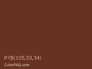 RYB 105,53,34 Color is a dark red color and the nearest color is Liver Organ #6c2e1f. Hex code #693122 and RGB value is rgb(105,49,34). In RGB color space, this color is composed of 41% red, 19% green, 13% blue, In CMYK color space, this color is composed of 0% cyan, 53% magenta, 68% yellow , 59% black , In HSL color space, this color has a hue angle of 13° , 51% saturation and 27% lightness.