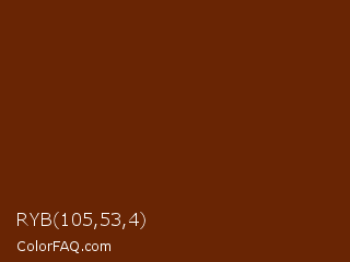 RYB 105,53,4 Color is a very dark orange color and the nearest color is Cedar Wood Finish #711a00. Hex code #692504 and RGB value is rgb(105,37,4). In RGB color space, this color is composed of 41% red, 15% green, 2% blue, In CMYK color space, this color is composed of 0% cyan, 65% magenta, 96% yellow , 59% black , In HSL color space, this color has a hue angle of 20° , 93% saturation and 21% lightness.