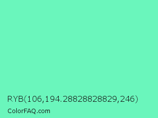 RYB 106,194.28828828829,246 Color is a light green color and the nearest color is Medium Aquamarine #66ddaa. Hex code #6af6bc and RGB value is rgb(106,246,188). In RGB color space, this color is composed of 42% red, 96% green, 74% blue, In CMYK color space, this color is composed of 57% cyan, 0% magenta, 24% yellow , 4% black , In HSL color space, this color has a hue angle of 155° , 89% saturation and 69% lightness.