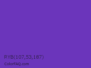 RYB 107,53,187 Color is a normal violet color and the nearest color is Purple Heart Crayola #652dc1. Hex code #6b35bb and RGB value is rgb(107,53,187). In RGB color space, this color is composed of 42% red, 21% green, 73% blue, In CMYK color space, this color is composed of 43% cyan, 72% magenta, 0% yellow , 27% black , In HSL color space, this color has a hue angle of 264° , 56% saturation and 47% lightness.