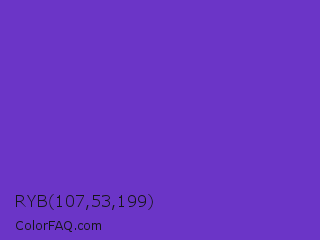 RYB 107,53,199 Color is a normal violet color and the nearest color is Purple Heart Crayola #652dc1. Hex code #6b35c7 and RGB value is rgb(107,53,199). In RGB color space, this color is composed of 42% red, 21% green, 78% blue, In CMYK color space, this color is composed of 46% cyan, 73% magenta, 0% yellow , 22% black , In HSL color space, this color has a hue angle of 262° , 58% saturation and 49% lightness.