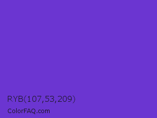 RYB 107,53,209 Color is a normal violet color and the nearest color is Purple Heart Crayola #652dc1. Hex code #6b35d1 and RGB value is rgb(107,53,209). In RGB color space, this color is composed of 42% red, 21% green, 82% blue, In CMYK color space, this color is composed of 49% cyan, 75% magenta, 0% yellow , 18% black , In HSL color space, this color has a hue angle of 261° , 63% saturation and 51% lightness.
