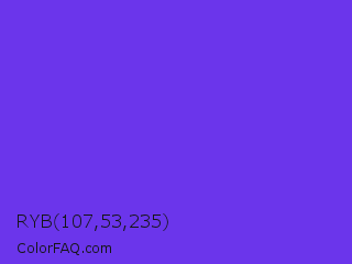 RYB 107,53,235 Color is a normal indigo color and the nearest color is Majorelle Blue #6050dc. Hex code #6b35eb and RGB value is rgb(107,53,235). In RGB color space, this color is composed of 42% red, 21% green, 92% blue, In CMYK color space, this color is composed of 54% cyan, 77% magenta, 0% yellow , 8% black , In HSL color space, this color has a hue angle of 258° , 82% saturation and 56% lightness.