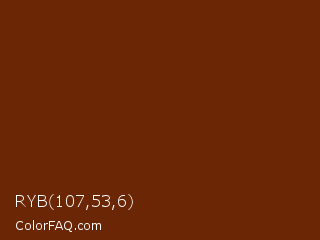 RYB 107,53,6 Color is a very dark orange color and the nearest color is Hairy Heath #6b2a14. Hex code #6b2606 and RGB value is rgb(107,38,6). In RGB color space, this color is composed of 42% red, 15% green, 2% blue, In CMYK color space, this color is composed of 0% cyan, 64% magenta, 94% yellow , 58% black , In HSL color space, this color has a hue angle of 19° , 89% saturation and 22% lightness.